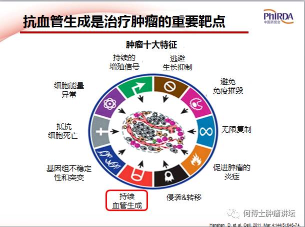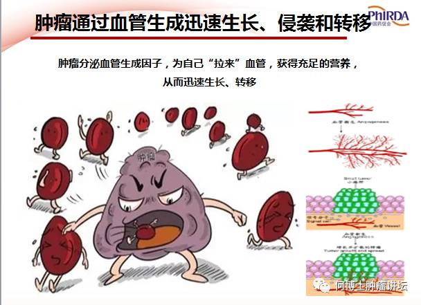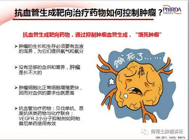 持续的血管生成是肿瘤生长的关键机制,因此,抗血管生成的靶向药物能够抑制肿瘤血管生成,缺少血供和氧分的肿瘤细胞就会被“饿死”。