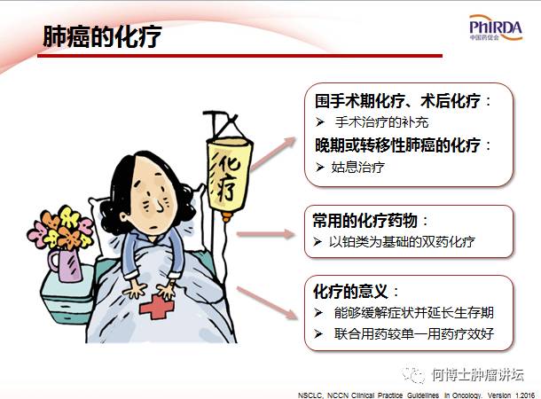 肺癌的化疗可选择方案较多,对于晚期一线治疗来讲,目前推荐包含一个铂类的两药化疗方案,如紫杉醇+卡铂、多西紫杉醇+顺铂等,对于非鳞癌患者一线化疗还可选用培美曲赛+顺铂或卡铂。