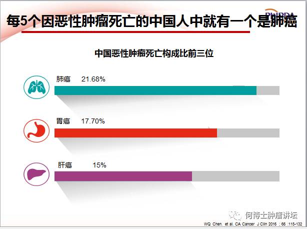 此图为我国由各种恶性肿瘤导致的死亡构成比例图,明显可以看到由肺癌导致的死亡占比最高,超过了五分之一,也就是每五个因恶性肿瘤死亡的人中,就有一个是肺癌导致的死亡。