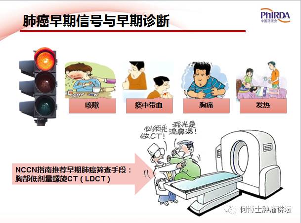 当身体出现咳嗽(如无明显诱因的刺激性咳嗽持续2-3周且治疗无效;原有慢性呼吸道疾病,咳嗽性质改变),痰中带血(短期内持续或反复痰中带血或咯血且无其他原因可解释),胸痛,长时间低热时有可能是肺癌的早期信号,需要去医院做辅助检查,其中胸部低剂量螺旋CT是早期筛查的首选,有利于早期发现病变。
