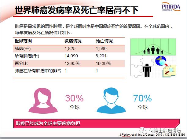 肺癌是最常见的恶性肿瘤,是全球同时也是中国癌症死亡的首要原因。在世界范围内,肺癌的发病占到所有肿瘤的13%,而死亡更是占到了近20%,也就是每五个因肿瘤死亡的人中就有一个是死于肺癌。不论发病率还是死亡率,肺癌均位居首位。从发生性别来看,男性病人占到了肺癌病人的70%,女性为30%。