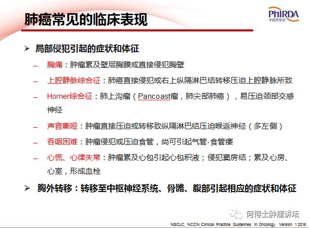 5%-15%的患者无症状,仅在常规体检、胸部影像学检查时发现。其余的患者可或多或少表现与肺癌相关的症状与体征,按部位可分为原发肿瘤、局部侵犯和胸外转移的表现。