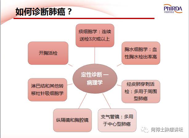 然而即使影像学检查高度怀疑肺癌,仍然不能确诊,必须通过病理学方法才能做定性诊断。病理学诊断最常见的是支气管镜活检,痰细胞学检查,胸水细胞学检查,经皮肺穿刺活检,纵隔镜,胸腔镜或开胸活检。