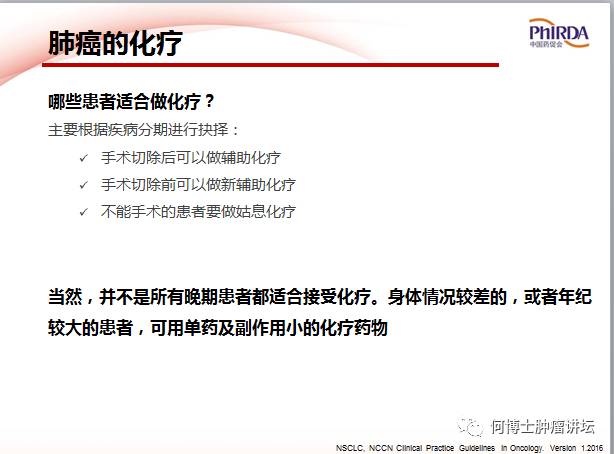 当然,并不是所有晚期患者都适合接受化疗。对于身体情况较差的患者,不适合进行全身化疗。而对于老年(>75岁)患者,选用单药及副作用小的化疗药物是比较合理的