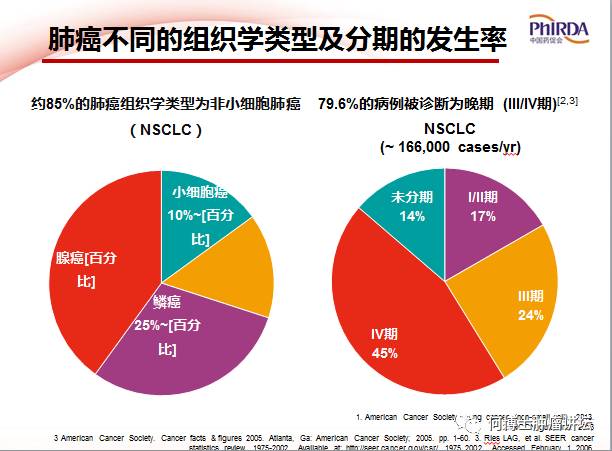 平时我们常说肺癌病人是早期、中期或晚期,是指病人处于肺癌这个疾病的某个阶段,这是通俗的说法。医学上肺癌的分期从早期到晚期分别是Ⅰ、Ⅱ、Ⅲ、Ⅳ期。如果病人是Ia期,就是指属于早期。但如果是Ⅳ期,那就是晚期了。从右图中可以看到70%的病人就诊时已经是Ⅲ和Ⅳ期。