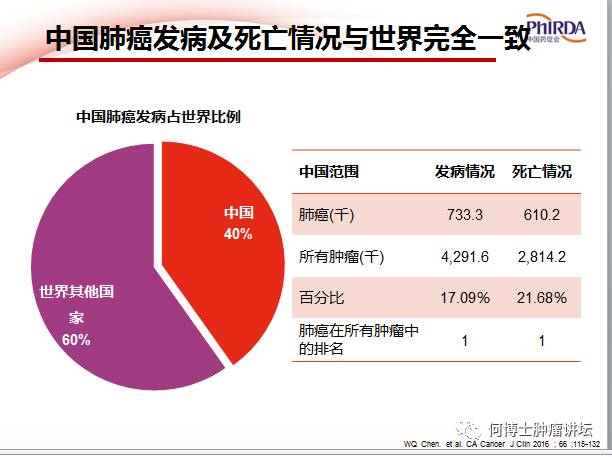 从数据上来看,中国的肺癌发病率与死亡率均与世界水平完全一致,在中国所有恶性肿瘤发病率排行第一位。从横向来看,中国肺癌患者占到了世界的40%,可以说是一个非常高的比例