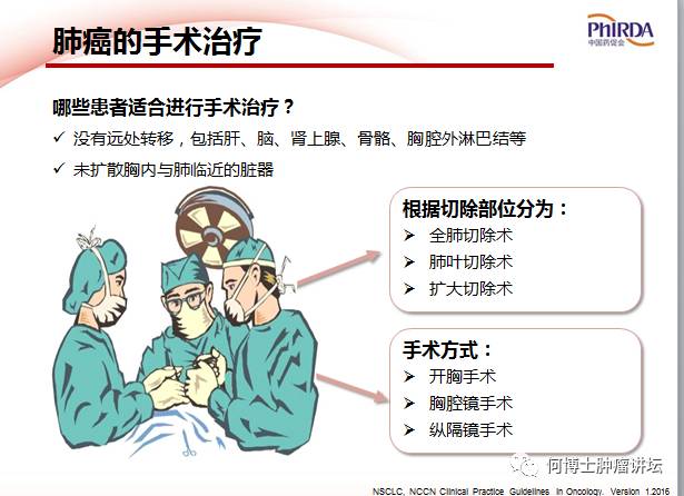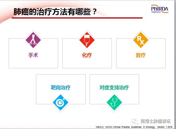 目前来讲,肺癌的五大治疗方法包括:手术、放疗、化疗、靶向治疗及对症支持治疗,其中处于核心地位依然是手术。