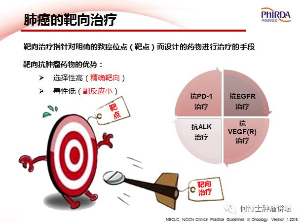 靶向治疗就是针对明确的致癌位点(靶点)而设计的药物进行治疗的手段。靶向治疗具有选择性高、毒性低的优势,副反应也比化疗小。部分药物已经在晚期费小细胞肺癌治疗中显示出较好的临床疗效,包括以表皮生长因子为靶点的靶向治疗(如易瑞沙、特罗凯),以肿瘤血管生成为靶点的靶向治疗(如贝伐单抗)等。