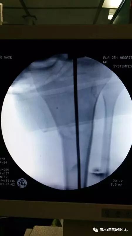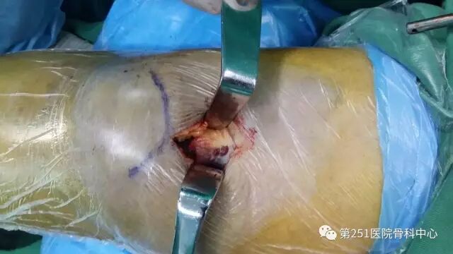 该手术技术要求置钉时膝关节处于完全伸直位,以提供进入关节腔内的空间。注意在置钉时要调整好进钉的角度,不要过前或过后。