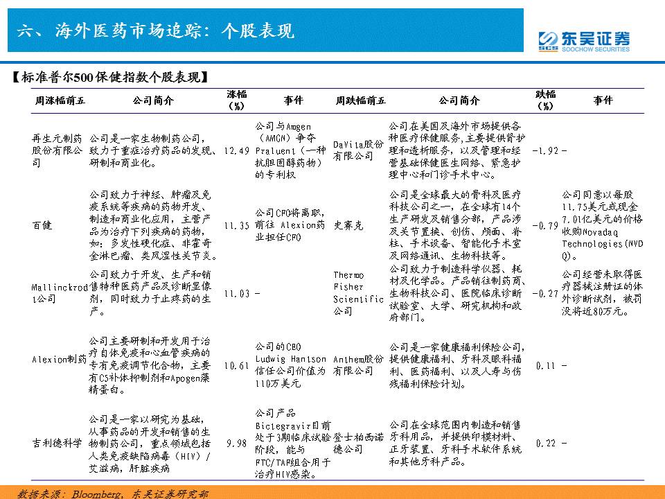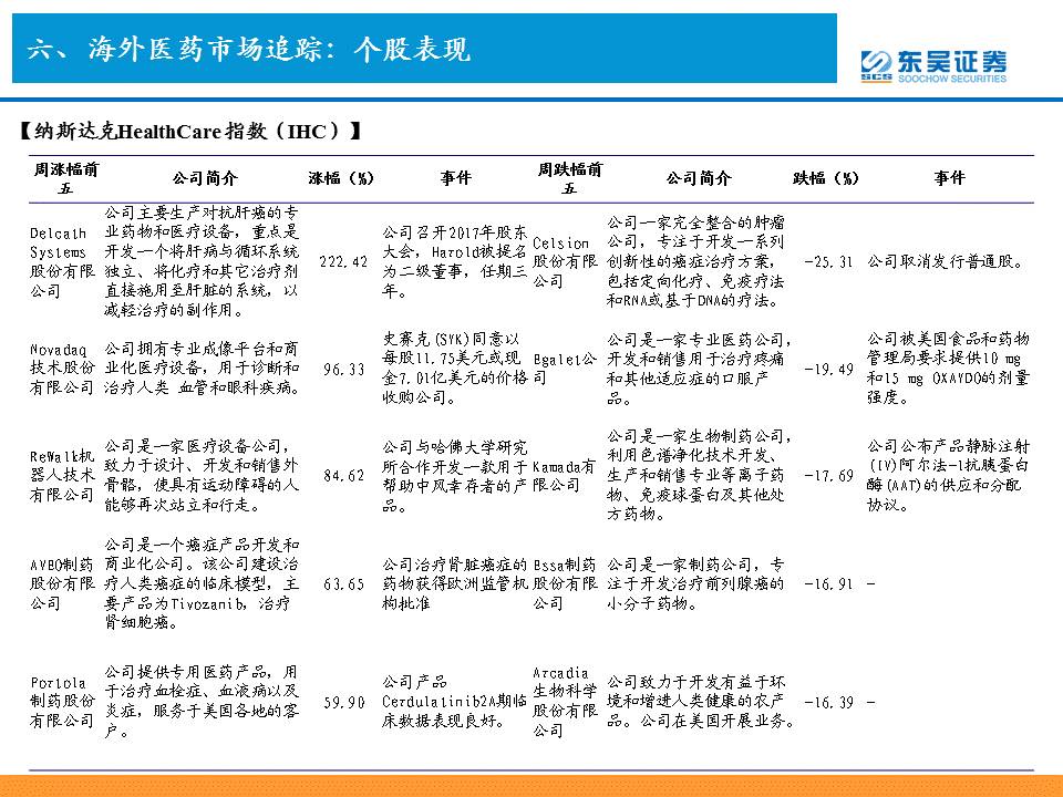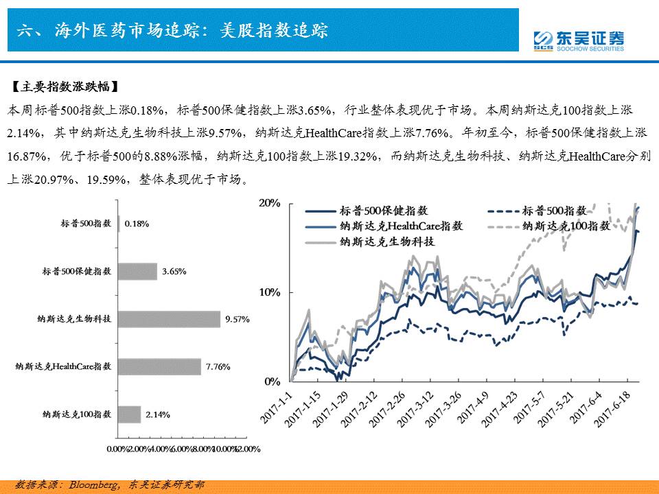 本周医药指数表现强势,标普500保健指数上涨3.65%,优于标普500指数上涨0.18%。纳斯达克生物科技和纳斯达克HealthCare指数上涨9.57%和7.76%,而纳斯达克100指数则上涨2.14%。