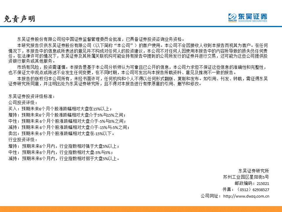 本研究报告仅供东吴证券股份有限公司(以下简称“本公司”)的客户使用。本公司不会因接收人收到本报告而视其为客户。在任何情况下,本报告中的信息或所表述的意见并不构成对任何人的投资建议,本公司不对任何人因使用本报告中的内容所导致的损失负任何责任。在法律许可的情况下,东吴证券及其所属关联机构可能会持有报告中提到的公司所发行的证券并进行交易,还可能为这些公司提供投资银行服务或其他服务。