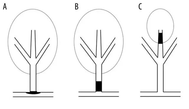 穿支动脉病变:载体动脉粥样硬化堵塞穿支动脉开口处(图 A);穿支动脉开口处动脉粥样硬化疾病(图 B);穿支动脉远端玻璃样变(图 C)。