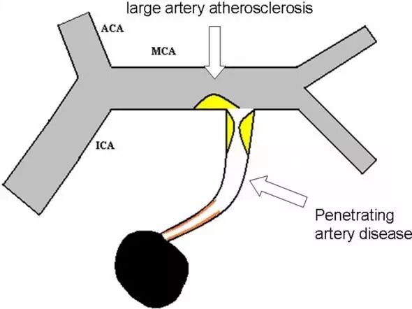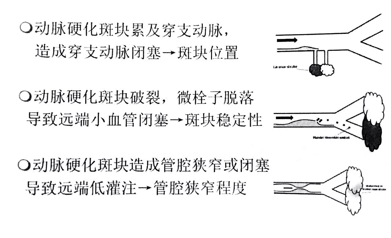 动脉硬化累及穿支动脉,造成穿支动脉闭塞--斑块位置;