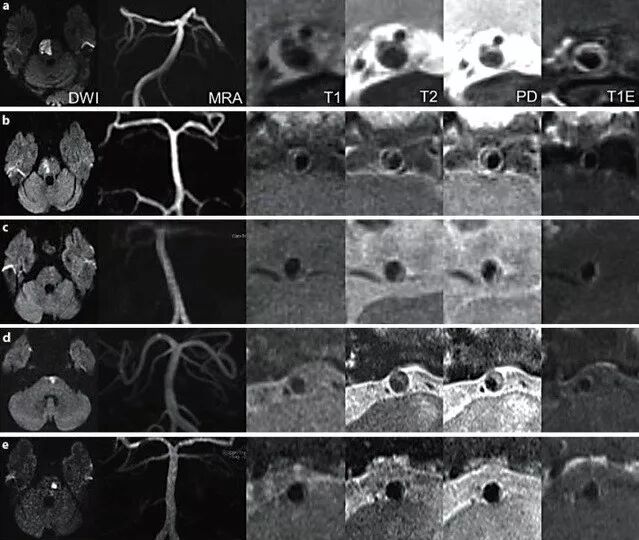 头颅MRI 证实脑桥基底部脑梗死,MRA 未见明显异常,高分辨率磁共振 T1、T2、PD、T1E 证实基底动脉的动脉粥样硬化斑块堵塞穿支开口。