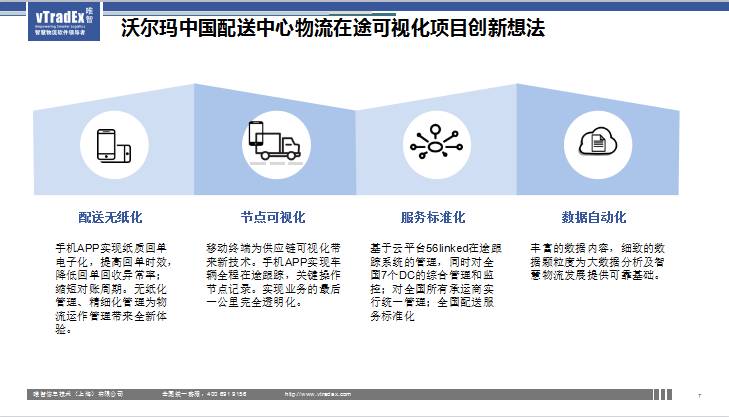 讲个案例,比如说沃尔玛中国,他们在美国用很高端的信息系统,包括仓储这块就是采用总部的系统,但是在运输这块沃尔玛完全没有办法,中国和美国完全不一样,美国很简单,他做越库,每个月台一辆整车出去配一家大的门店,很简单的运输,而且车型标准,没有再次外包。在中国不一样,标准化、可视化问题,沃尔玛决定我要用无纸化适合中国的解决方案来管理我的物流。看一下沃尔玛的架构,沃尔玛是代表大的货主方,代表供应链上面领头企业的。他在冷链配送这块用路径优化系统,他们主要解决了所有的约束问题,比如说我的门店到货时间有时间窗,比如说冷链装载的时候对装载的器具、温区有要求,比如说某个车辆某个时间段不能进入城市或区域。这个都需要带有模型、解决算法的工具来做的。沃尔玛做整体的解决方案,哪条线路分配到哪个经销商,约柜的方式,跟他对应承运商,这个时候他们通过公有云对接,就可以直接收到沃尔玛的定单,另外一部分是中小企业,他们自己也没有很好的信息化系统,这时候在公有云开帐号,直接就对应沃尔玛的定单,通过这种方式我们就搭起了以沃尔玛作为核心的生态圈,当然云不是沃尔玛一家,我们现在快销行业,基本上能够协同的公司全部在这上面。从沃尔玛来说,将所有的作业任务推给我们物流链APP,由物流链负责后段的移动跟踪、拍照上传。沃尔玛非常关注节点和采集的情况,希望知道装车效率,车从进入仓库开始,什么时候开始装车,什么装车完毕,什么时候发车的。以前这些节点全部是手工填报,而我们现在使用智能手机的GPS定位功能和摄像头功能等实时获取各作业节点的数据(包括业务数据和定位信息等),并自动形成KPI信息,实现无人工干预的考核方法,杜绝手工数据失真的问题。