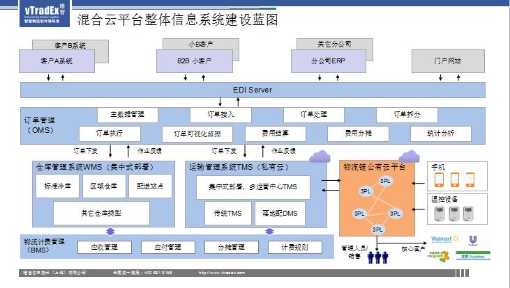 从某种意义上公有云是真正在帮助这个供应链链条里面中小企业,帮助他们提升。总体来讲,一个供应链的效率不是看老大,一定要看链条上面所有的参与者,如果下面的中小的不能提升,不能改进,我们整个供应链没办法改进,所以我们作为行业的服务商,我们要帮助中小的来改进,这个也是我们做混合云的一个初衷、目的。大家看到唯智公司在做信息化整体架构的时候,大家都很关注,因为有些企业说我要上TMS系统,WMS系统,哪块是云,应该怎么办。标准的架构部分还是企业的信息化,这个部分不能缺失,非常重要的。而另一端是把企业的私有云通过公有云延伸出来对接外部的承运商,对物流订单做全面的管理。