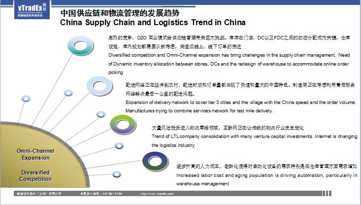 在这个行业里面有几个大的趋势:第一个趋势一定要谈O2O,我们虽然谈电商,但是我们也必须要看到传统,传统加电商门店的配送,以及仓的直接配送,这种O2O的模式是现在非常重要的商业模式。在O2O模式下,大家学过供应链的都知道,最难的还是库存,我们的安全库存应该部署在什么地方。现在很多做O2O的企业都对库存管理感到非常具有挑战性。如果是线上,如果有网站,线上会有库存,我们叫可售库存,可售库存的量通常是要做一个定义,同时我又会有线下库存,我们现在看到很多服装企业,很多做O2O的企业,他在仓这一块已经把线上和线下库存合并管理,并不会分两大块来做。从物流资源整合来讲这是非常重要的。