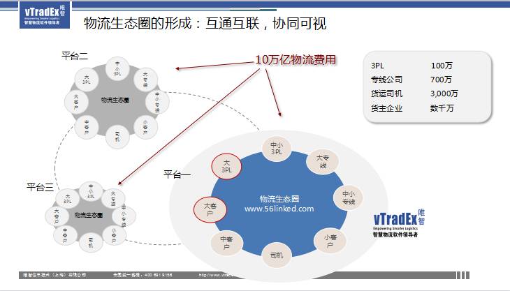 有几点比较重要,在这个生态圈里面大家是参与者,真的是需要互补的,至少大家的认同观、价值观应该是一样的。互补之后拿出一个自己能够有优势的资源。在生态圈里面当然会涵盖物流服务商、信息服务商、货主、穿戴设备、硬件提供商,很多角色都可以在这个生态圈里面进行互享。唯智也认为在这样一个大的环境下,我们最后会形成一个由我们的货主方、供应链的链主、三方,中小专线小客户司机、收货人形成了一个物流的生态圈,这个生态圈会整合10万亿的市场,车和资源。我们也认为不可能仅仅一个圈,一定会形成多个生态圈,但是没有问题,大家可以在多个生态圈间实现互联互通,协同可视,这也是我们认为非常重要的。