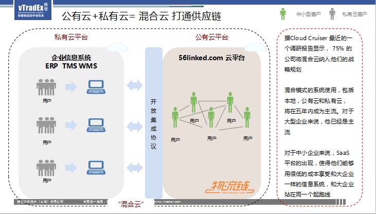 作为我们供应链信息化解决方案提供商,我们是提供信息化服务。我们对这个市场怎么来看呢?我们原来服务了很多很多大客户,那他们的需求是他们要做物流计划,他们要做仓库管理,他们要做定单管理,他们要做计费,我们在这块信息化解决方案,也就是为我们的货主方,为我们的企业提供的信息化服务。这块今天还仍然很重要,因为我们跟国外的情况不一样,就我们原来的信息化起点是比较低的,还是有很多企业需要信息化的。但是这样的信息化原来在没有互联网技术的时候是比较难打通的。现在不一样了,现在我们在企业这一块有叫做私有云的企业信息化。同时可以延伸出来做一个公有云的平台,就以我们互联互通的概念来说,我们是可以对任何的私有云进行开放,把他们来打通。