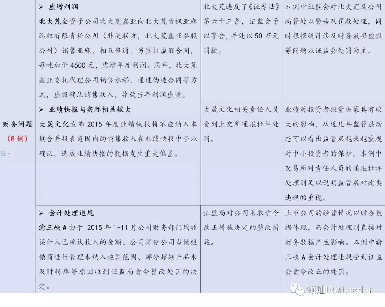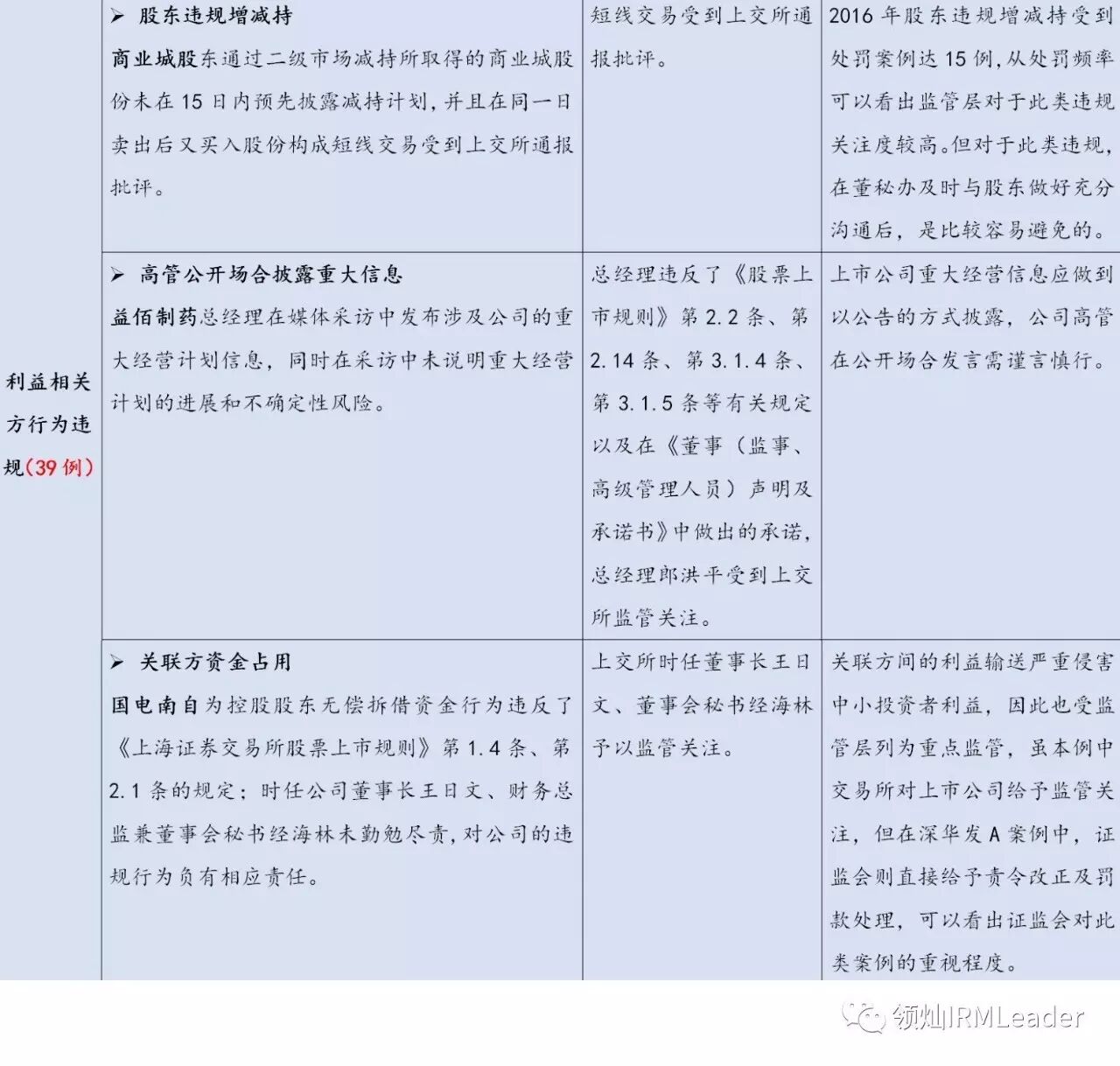 领灿根据违规性质将案例分为“未及时披露”、“利益相关方违规”、“重大遗漏”、“财务问题”、“虚假陈述”及“其他类”。截至2016年12月,A股市场共发生144例上市公司信批违规事件,其中未及时披露案例57例,占违规总数的39.58%;利益相关方行为违规(上市公司可控性较低)案例39例,占27.08%;重大遗漏案例有21例,占14.58%;财务问题案例8例,占5.56%;虚假陈述案例4例,占2.78%;由于其他原因违规的15例,占10.42%。