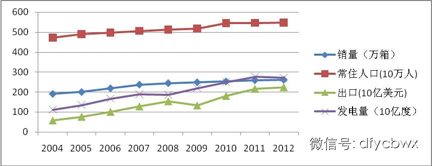 由相关系数表可以看出,卷烟销量与常住人口、出口金额、发电量之间的相关度最高,销量与这些高相关因素之间的时间序列趋势图如下: