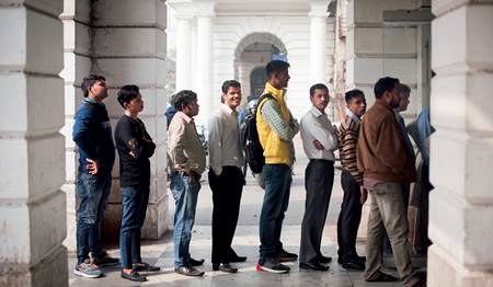 在印度首都新德里,市民在取款机前排队取现 毕晓洋摄/本刊