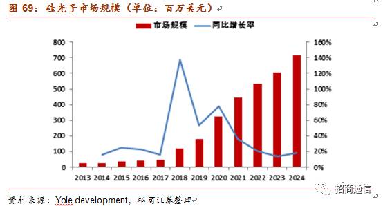 根据咨询公司Yole Development的预测,2013~2024年间,硅光子市场将以38%的年复合增长率迅速发展,高于微电子市场的10%增速,以及光通信行业的15%的增速。2024年,硅光子市场规模将由2013年的不到2500万美元增长至7亿美元。其中,硅光子器件的大规模商用,以及来自大型互联网公司数据中心的需求将使得硅光子市场在2018年迎来爆发。