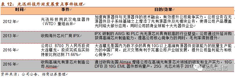 光迅科技在近十年来,通过不断的内生及外延并购,在有源光芯片、无源光芯片、光器件、高端光模块封装及制造等子领域进行一体化整合。目前已经成长为国内第一,全球第五,具有全产业链研发制造封装测试能力的企业。