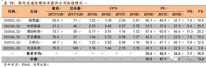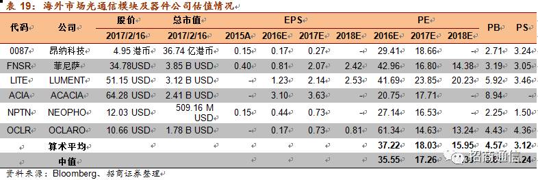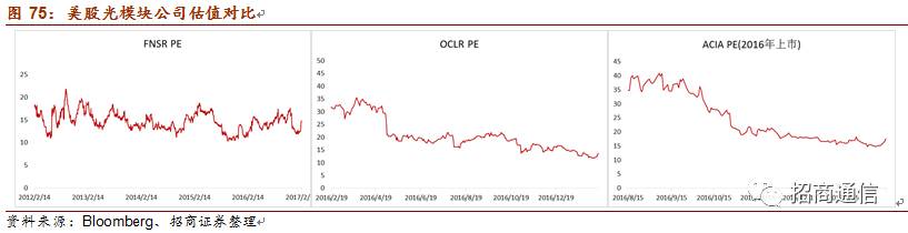 国内光模块及器件公司处于快速成长期,尤其是以光迅为代表的企业刚刚具备或者即将具备高速率光模块、高端光芯片的自研及制造能力,进口替代逻辑清晰,成长空间巨大,可以享受相对更高的估值溢价。