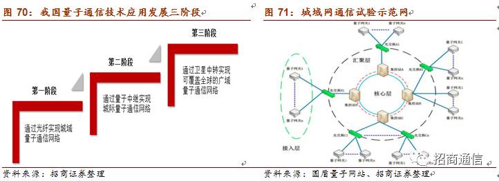 我国量子通信技术领先全球,量子通信通信技术应用即将迈入第三阶段。近年来,我国的量子通信技术取得了飞速的发展。,我国量子通信技术的实际应用分为三步走:一是通过光纤实现城域网量子通信网络;二是通过量子中继实现城际量子通信网络;三是通过卫星中转实现可覆盖全球的广域量子通信网络。2016年,随着量子通信卫星“墨子号”的成功发射以及量子通信“京沪干线”合肥至上海段的开通,我国量子通信技术实际应用即将走完前两部,进入第三阶段。