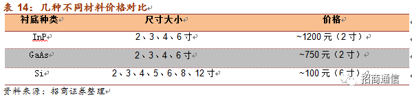 硅光子器件的优势在于集成度高和随之带来的成本降低。提高集成度实现量产,进而降低成本打开应用市场是从半导体集成电路行业发展中获得的经验。然而在光芯片领域,光芯片使用的InP衬底和GaAs衬底因为材料生长的限制导致难以获得大尺寸的单晶晶圆,进而既限制了其大规模生产,同时也使成本居高不下。2寸的GaAs衬底,其价格大约在750元左右,而同样尺寸InP衬底的价格则更贵,大约在1200元左右,于此形成鲜明对比的是Si衬底,1个6寸的硅衬底的价格大约在100元,远低于InP和GaAs衬底的价格。