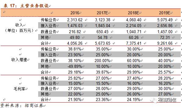 2) 接入业务:当前10G PON正值规模部署前夜,公司已形成全系列EPON/GPON、10G PON光收发模块产品线及完善的FTTX解决方案,并具备10G DFB光芯片核心技术,业绩成长可期。预计2017~2019年相应收入增速分别为25%、20%和20%;毛利率为15.5%、16%、16.2%。