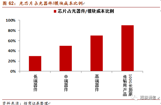 光芯片成本在光模块成本中占据较高比例。在光模块中,光芯片占据最高价值端,成本占比高,并且越高端的器件,芯片成本占比越高。按照高中低端划分,低端光器件中芯片成本占比为30%左右,中端光器件中芯片成本占比为50%左右,高端光器件中芯片成本占比为70%。对于最新应用的100G长距离光模块,芯片成本占比更是高达90%。