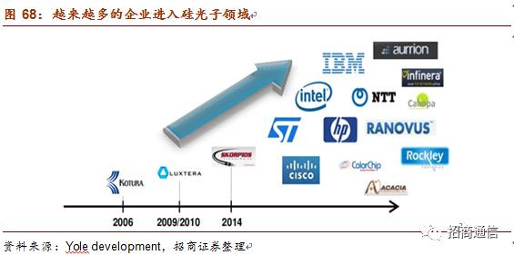 巨头布局,技术突破,硅光子商用化进程加速。Intel从上个世纪九十年代中期就开始着手研究硅光子技术,经过多年不懈努力才取得了今日在硅光子领域的行业领导地位,并开始逐步推进硅光子产业化。现阶段,国际上从事硅光子研究的公司主要包括Intel、IBM、Luxtera、Kotura、Acacia,在国内从事相关研究和产品开发的公司包括光迅科技等。