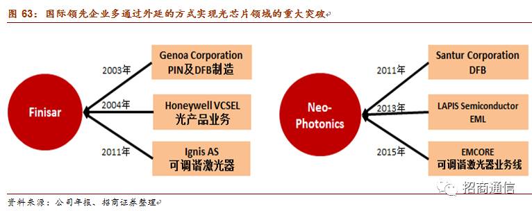 光芯片技术门槛高、研发周期长,国外公司多以外延的方式实现光芯片领域的突破。总体来说,光芯片行业属于高技术壁垒的行业,产品从研发到商用需要经历较长时间。此外,只有长期的技术积累才能保证产品良率满足商用要求。在此背景下,国外公司多通过外延的方式实现在芯片领域的突破。以Finisar为例,其VCSEL、DFB以及可调谐激光器的制造能力皆通过收购相关光芯片公司实现。
