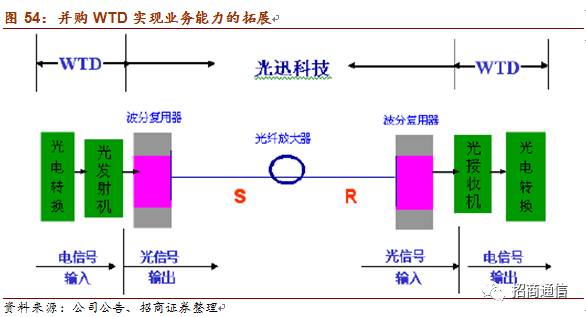 2012年光迅科技同WTD实现重组合并。在此之前,两家公司的产品在整个光通信行业中的位置及发挥的功能存在差异,WTD的产品主要用于光的发射与接收,实现光电信号的转换,而光迅科技的产品主要用于光信号的放大、耦合、分波与合波,实现光信号的大容量、长距离传输,即WTD的产品主要用于接入网领域,而光迅科技的产品主要用于传输网领域。合并之后,新公司(仍叫光迅科技)业务能力得到扩展,并一举跻身全球光器件前五强。