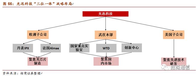 在资源配置上,公司构建“三位一体”战略规划:欧洲子公司包括IPX和Almae,主要从事高端光芯片的生产;美国子公司主要从事新技术的研发;国内是公司产品销售的主要市场,同时依托武汉光谷产业集群,打造信息光电子领域开放、多元的创新平台,建成国家级信息光电子制造业创新中心,引领信息光电子制造行业发展。