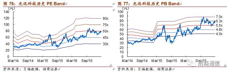 光迅科技是国内光器件及模块领域龙头,并且从自主高端光芯片研发及量产能力以及硅光子布局的情况来看,公司在A股市场上具备稀缺性。此外,在量子通信领域的想象空间也有助于公司突破行业发展的天花板。从估值的角度来看,目前申万一级行业中通信行业的平均估值为45.6倍。分析A股光器件/光模块相关标的,估值区间在42.3到88.1倍之间,PE中位数为56.9倍。