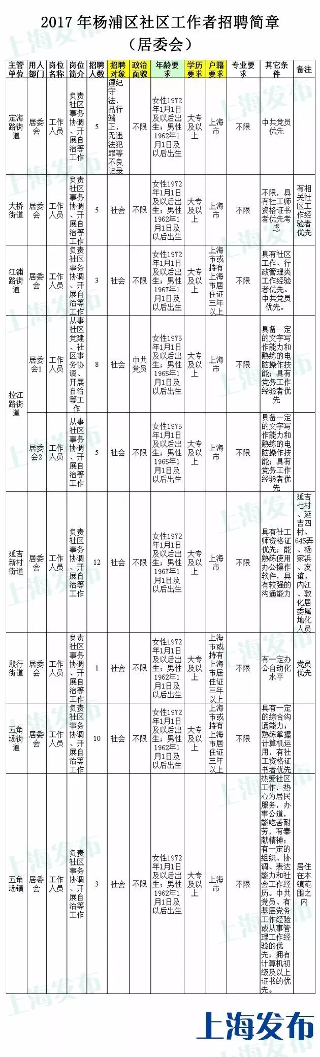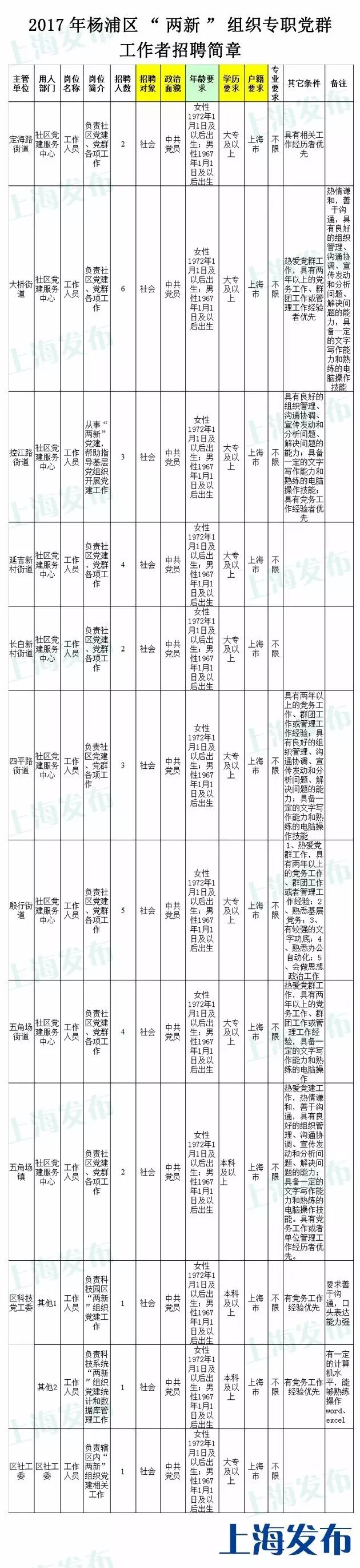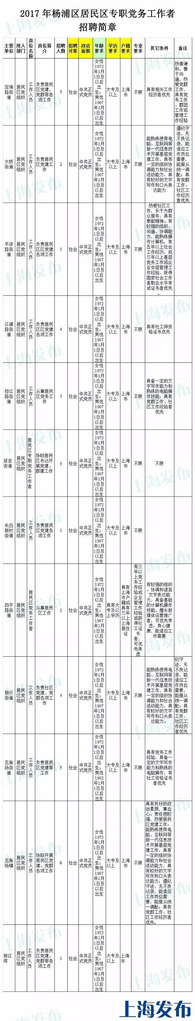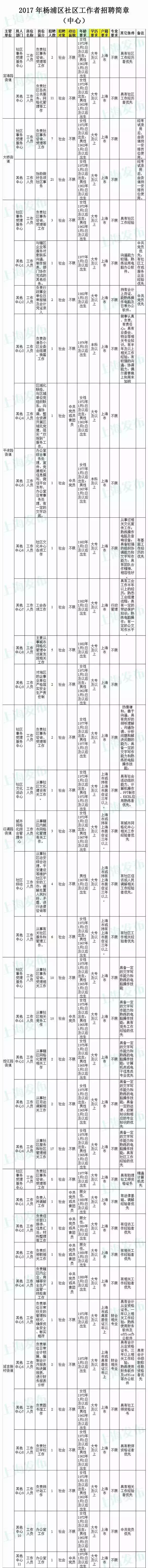 、上海市杨浦区人民政府关于印发《杨浦区社区工作者管理办法(试行)》的通知(杨委发〔2015〕18号)要求,按照公开、平等、竞争、择优的原则,杨浦区于2017年上半年向社会公开招聘一批社区工作者。现将有关事项公告如下: