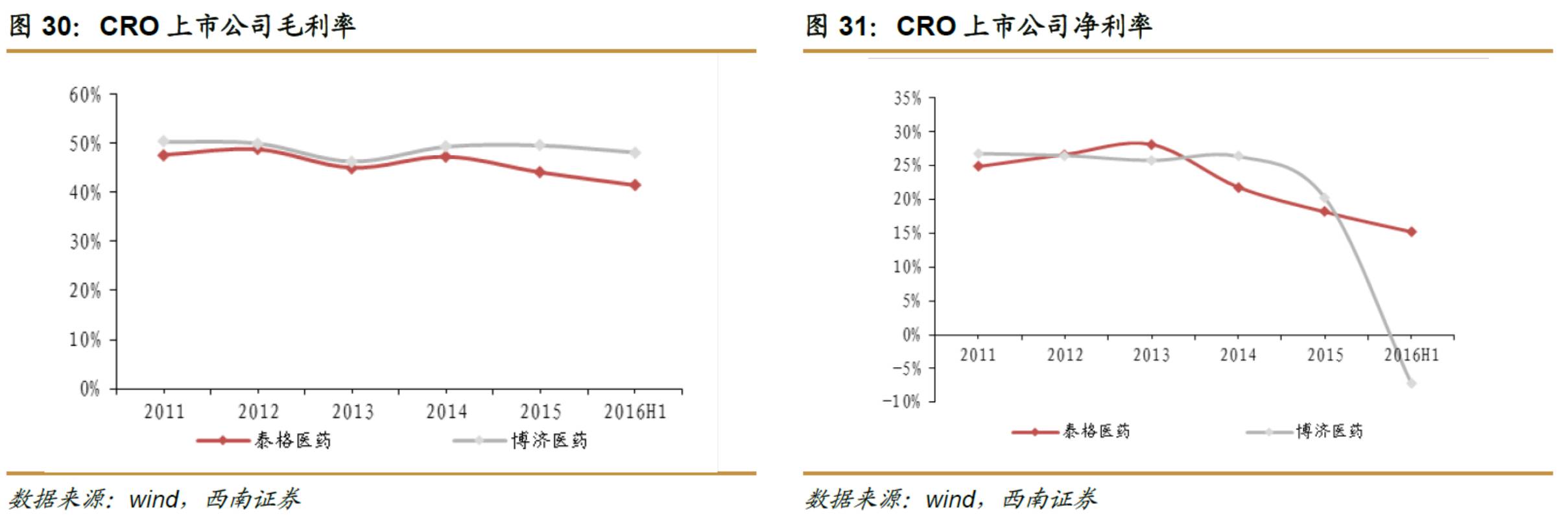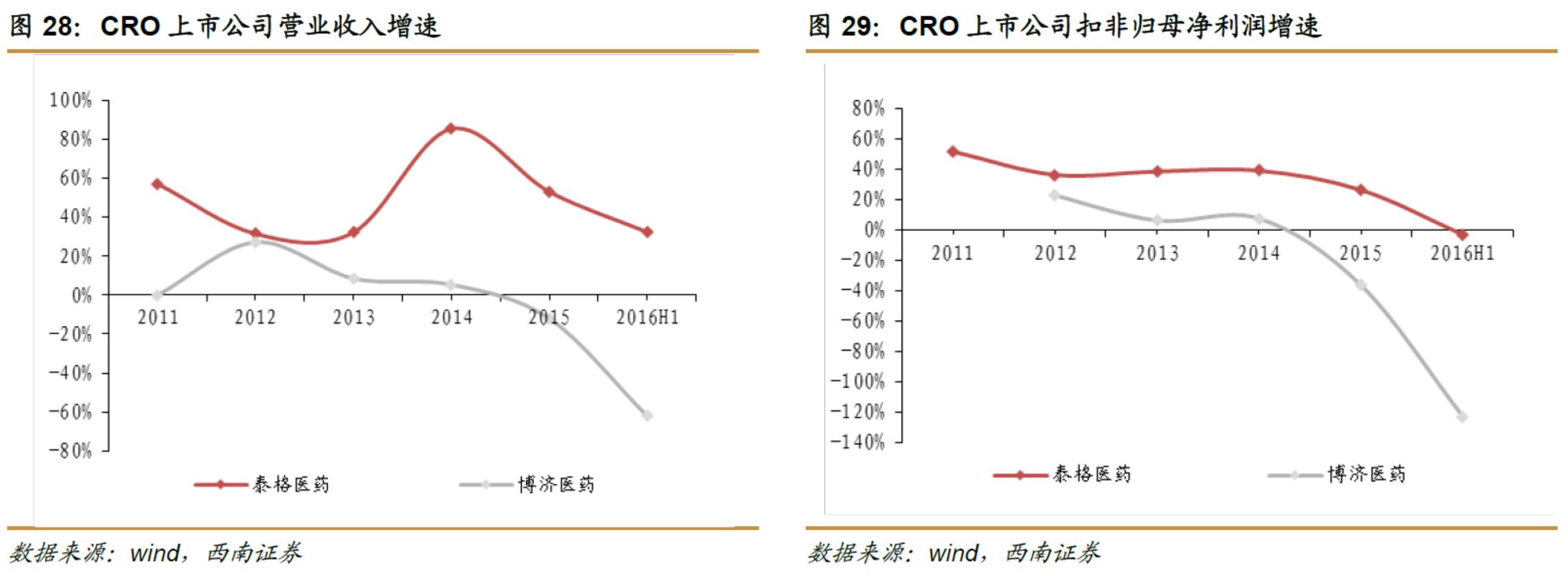 2016H1,CRO相关上市公司中,泰格医药收入同比增长32.48%,净利润同比增长0.80%;博济医药收入同比增长-62.5%,净利润同比增长-113.56%。