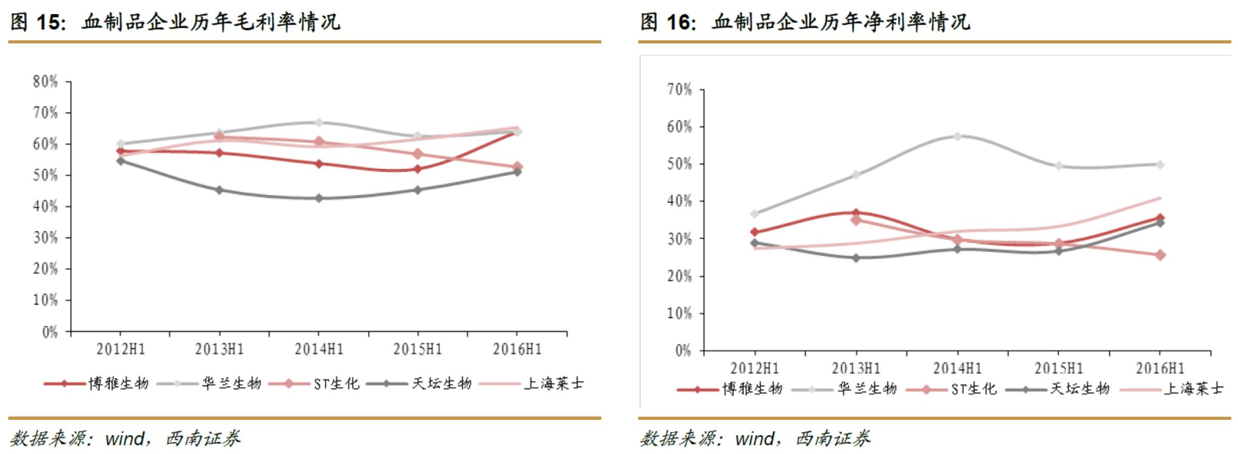 血制品在制药行业中地位特殊:供不应求现象严峻,据WHO测算,我国的血浆需求量为1.2万吨,而2015年全国血浆供给量仅约6000吨,严重的供需缺口推动血制品价格持续上涨。在部分省份浆站审批态度转暖和最高零售价限制放开的共同作用下,血制品行业量价齐升,相关上市公司2016H1收入和利润均加速,收入的平均增速为29%,扣非净利润的平均增速为47%,毛利率和净利率均呈现上行趋势。