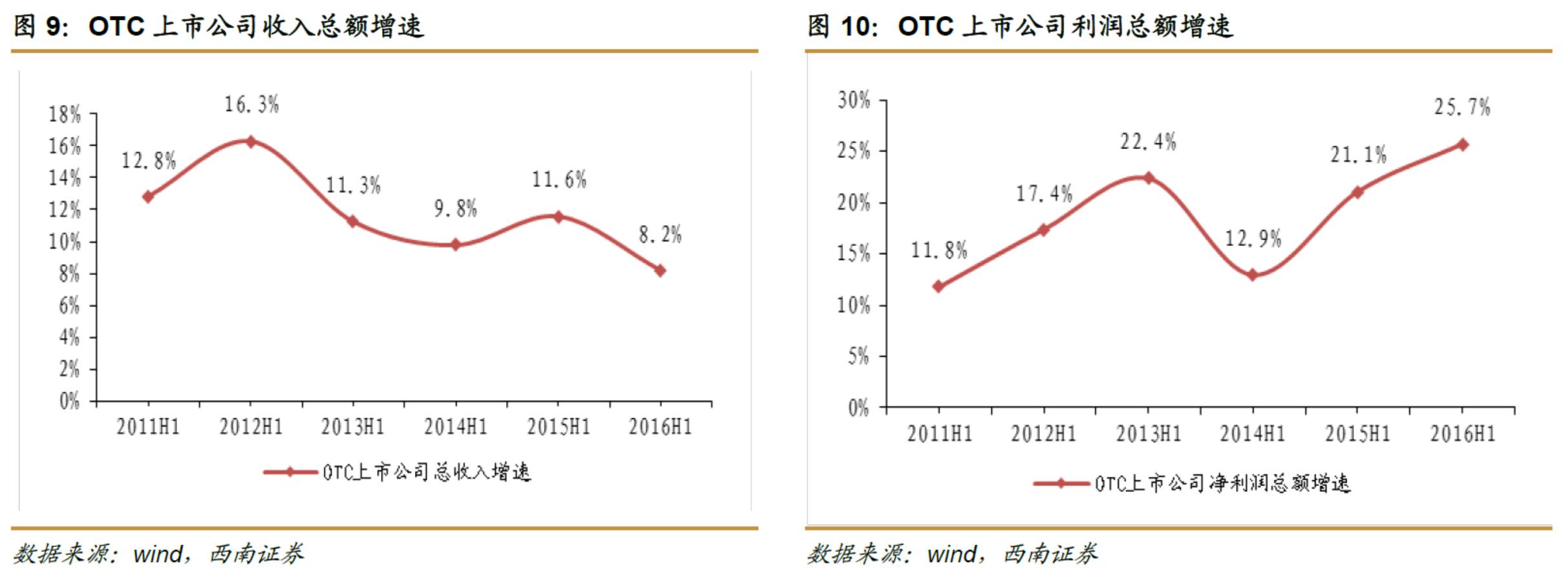 2016H1OTC上市公司收入总额同比增速为8.2%,利润总额同比增长25.7%。若从单季度看,2016Q2收入总额同比增长5.7%,相对Q1下滑5个百分点;净利润同比下滑1.47%,相对Q1下滑54.6个百分点。