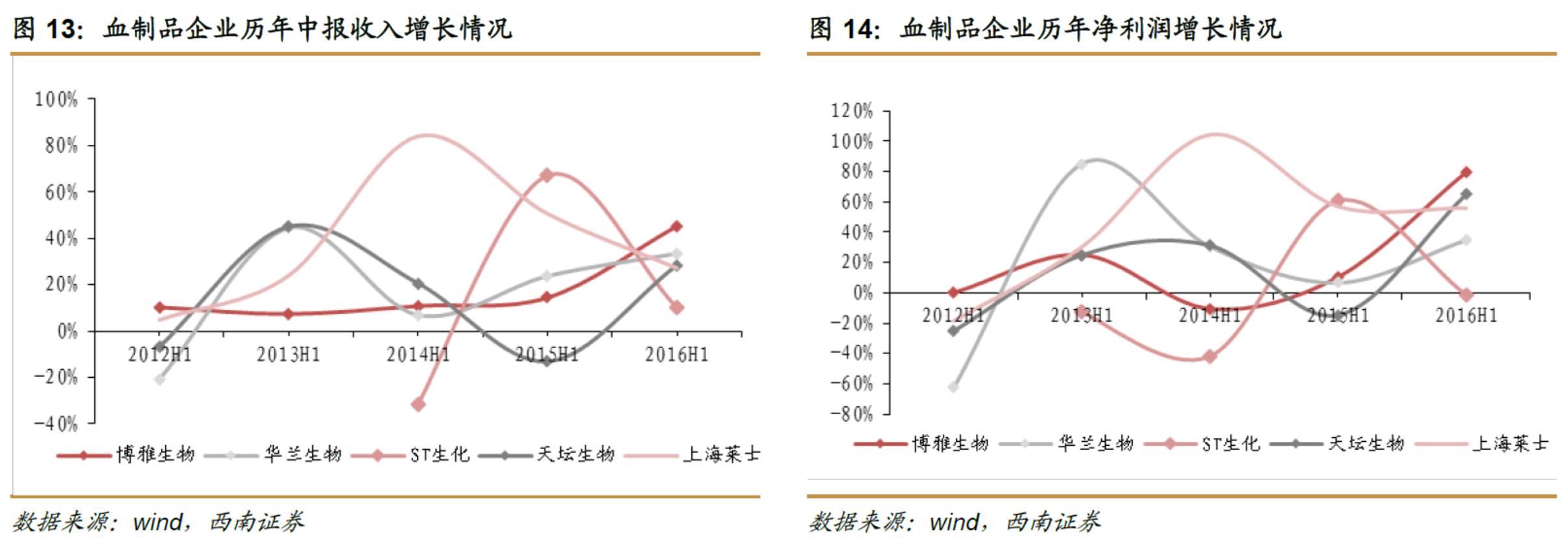 从各个公司的表现来看:博雅生物的收入和利润增长均为5家血制品上市公司中最快,其“体量规模小+小品种提价幅度大”赋予其对行业变化的高业绩弹性;行业龙头华兰生物、上海莱士收入增长均在30%以上,充分享受行业景气度提升;受狂免降价及期间费用计提影响,ST生化增速相对缓慢,但我们认为随着新批浆站放量和历史遗留问题处理,未来业绩高增长可期。