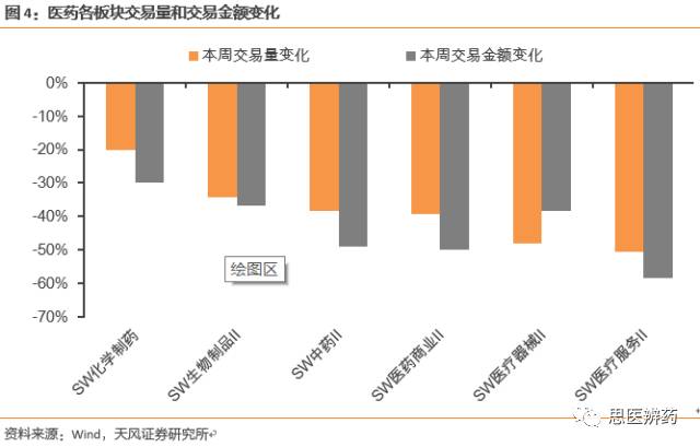 本周各板块成交量和成交额表现偏弱。其中化学制药板块表现较好,交易量和交易额分别下降20.13%和29.84%,医疗服务表现相对较弱,交易量和交易额分别下降50.65%和下降58.33%。