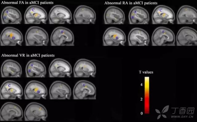 DTI 研究发现 MCI 存在诸多白质区域完整性破坏,如额叶、颞顶叶、下额-枕叶束、上纵束、胼胝体和扣带束等。与功能连接类似,AD 疾病进程中结构连接的改变早于明显的灰质体积萎缩。这些结果提示 DTI 有可能作为 AD 早期诊断的生物标志物。