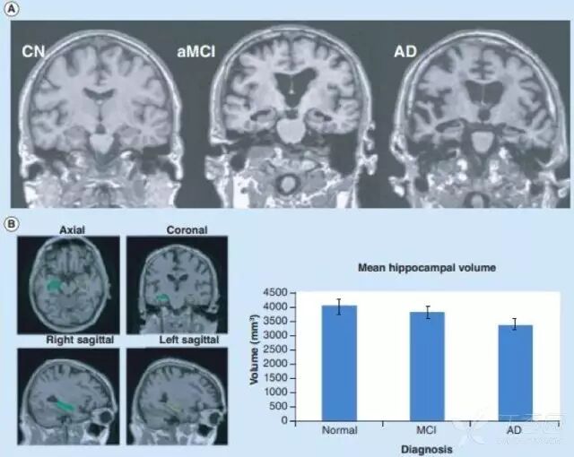 sMRI 可测量区域性或全脑体积大小,反映因细胞损伤、轴突退变、突触失调引起的结构萎缩。最早出现并进行性加重的内侧颞叶结构萎缩可能是 AD 早期出现的特征性改变,其中海马萎缩,被认为是 MCI 进展到 AD 痴呆的最佳标志物。