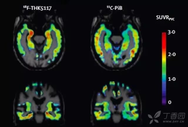 图 8 AD 患者以 18F-THK5117 和11C-PiB 为显影剂的 tau 蛋白和 Aβ成像 10