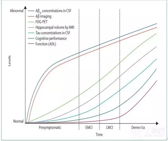 在这段漫长的临床前期中,病理生理改变在出现临床症状的 15~20 年前就已经开始。对 AD 干预时间太晚可能是治疗失败的关键原因。因此,早期诊断、及时干预是目前唯一有效延缓疾病进展的措施。