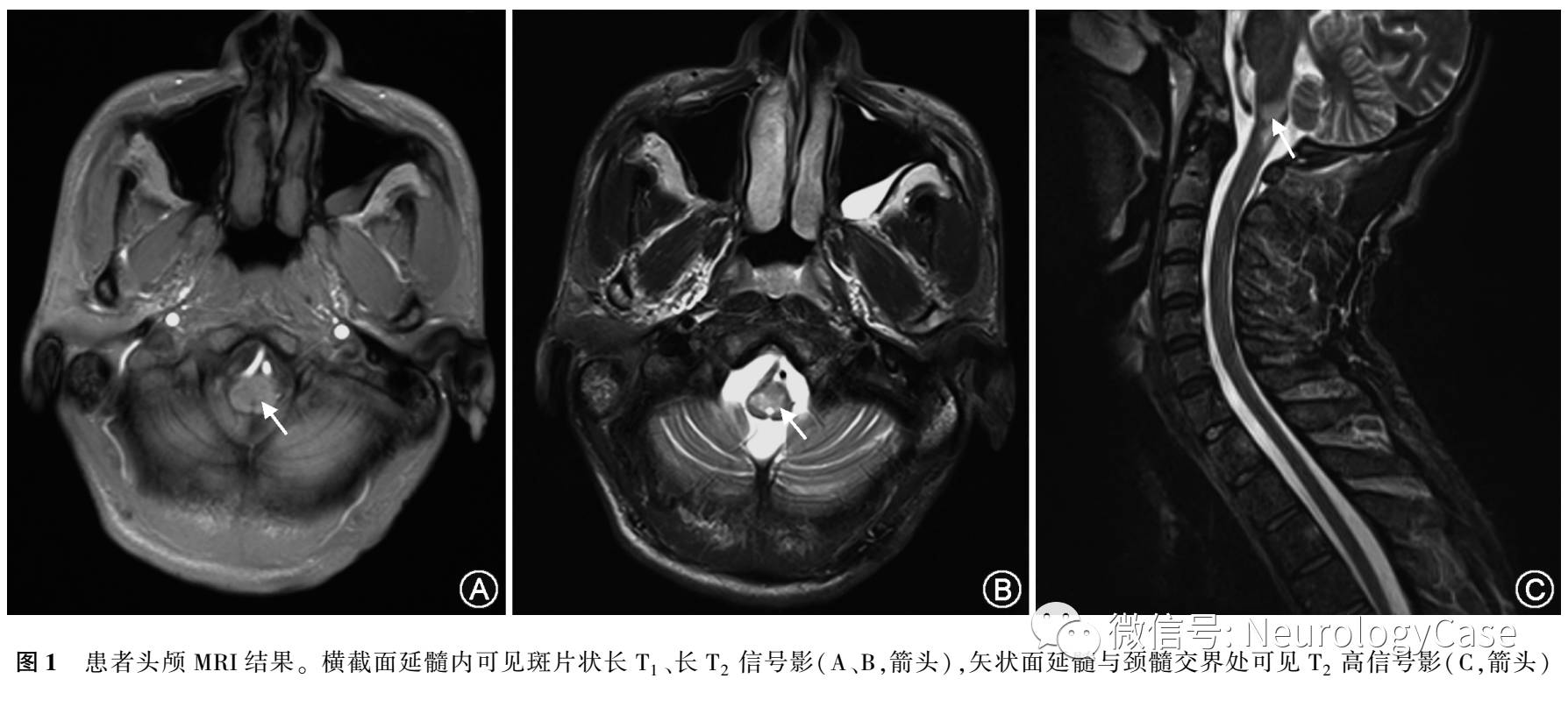 患者男性,43岁,以“右面部发麻伴头晕20余天,头痛2d”为主诉入院。20余天前患者被电焊光闪眼后出现右侧面部发麻,至当地诊所按“感冒”处理,2d后出 现头晕,表现为视物旋转、不敢睁眼,伴呃逆、恶心、非喷射性呕吐,呕吐物为胃内容物,无发热、视物重影、肢体麻木无力,就诊于驻马店市人民医院,予以口服药物(具体不详)治疗后无好转,遂至郑州颐和医院行腰椎穿刺脑脊液检查未见明显异常,头颅MRI示:脑干病变。按“脑炎”予以激素、抗病毒、改善循环、止晕、护胃等治疗半个月后复查头MRI病灶较入院时病变范围减小,症状减轻后出院。患者本次入院2d前开始出现右侧头痛,呈阵发性针刺样疼痛,伴双下肢麻木、发凉、无力,自觉头晕、恶心加重,为求进一步诊治来我 院。神经科体检:意识清楚,言语流利,高级智能活动正常,双侧瞳孔等大等圆直径3mm,对光反射灵敏,眼球运动充分,双眼可见水平及垂直眼震,余脑神经体检未见明显异常,四肢肌张力正常,双上肢肌力Ⅴ级,双下肢肌力Ⅳ级,双上肢腱反射(++),双下肢腱反射(+),双手快速轮替试验正常,双手指鼻快准,双下肢膝上10cm以下感觉倒错,深感觉正常,双侧霍夫曼征(-),巴宾斯基征(-),余体检欠配合。辅助检查:血尿便三大常规、红细胞沉降率、C反应蛋白、凝血功能、肝肾功能、电解质、血脂、甲状腺功能及甲状腺抗体、风湿免疫全套无明显异常;脑脊液常规、生化、细胞未见异常,IgG指数0.82(正常值0.3-0.7),寡克隆区带(-),脑脊液AQP4抗体阳性(细胞免疫荧光法)。头颅MRI平扫+增强示:延髓异常信号,炎性或脱髓鞘病变可能大。颈胸腰椎MRI示:延髓与颈髓交界处异常信号,炎症或脱髓鞘可疑 待查(图1)。肌电图示左腓肠肌神经源性改变,左腓肠神经末梢感觉传导速度减慢,左正中神经F波出现率异常,潜伏时未见异常;运动诱发电位示左下肢锥体束传导未见异常,脊髓刺激周围段传导延迟;体感诱发电位示左下肢深感觉传导路P40未引出;视觉诱发电位示双眼P100未引出。