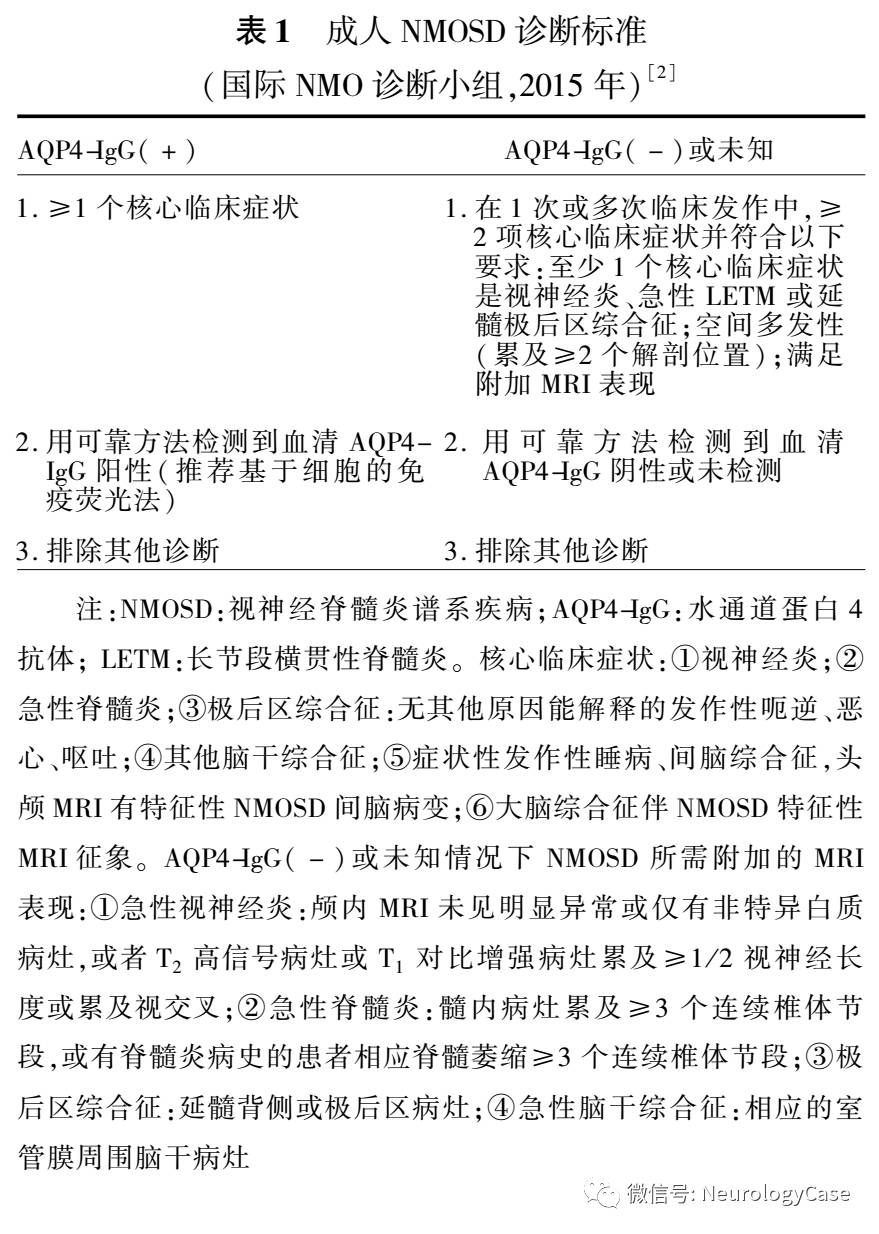2015年国际NMO诊断小组对NMOSD的诊断标准进行修订,并根据血清学检测(是否有AQP4-IgG)进一步分类。对于AQP4-IgG阳性的NMOSD,核心临床特征是有视神经、脊髓、极后区、脑干其他部位或大脑相关的临床表现或MRI表现。对AQP4-IgG阴性或无法行血清学检测的NMOSD诊断,则需要更为严格的临床标准及神经影像学表现。此外,还提出了儿童NMOSD的诊断标准,以及单相NMOSD、视神经脊髓型多发性硬化的概念。成人NMOSD诊断标准见表1。